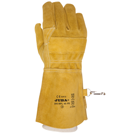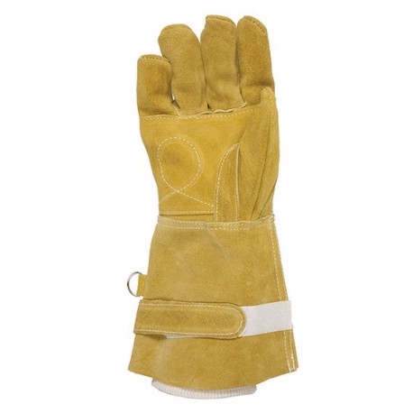 Guante de serraje de crupón vacuno con refuerzo de serraje en nudillos y palma. Manguito de algodón interior.