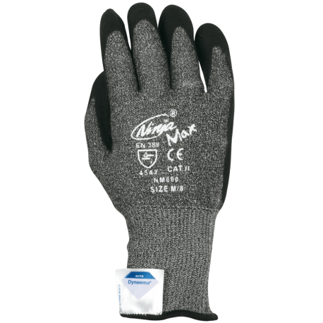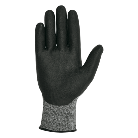 Guante de Dyneema® con fibras sintéticas, recubierto en la palma con bipolímero (mezcla de poliuretano y nitrilo).