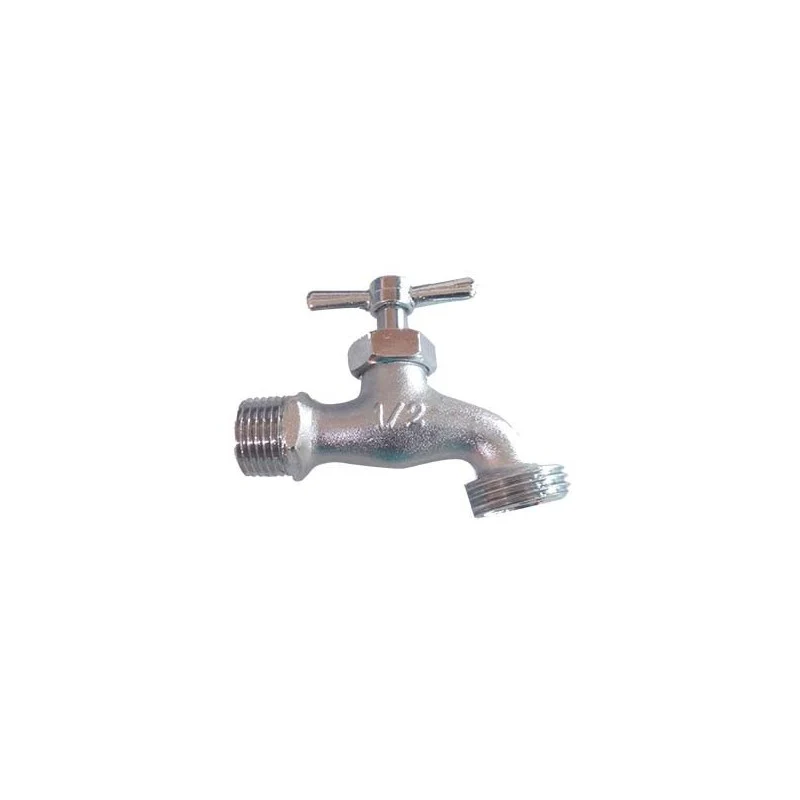 Llave de paso tipo roca para manguera, fabricada en aleación metálica de alta resistencia y recubierta con acabado niquelado que mejora su durabilidad y apariencia. Diseñada para trabajos exigentes en exteriores o zonas húmedas.