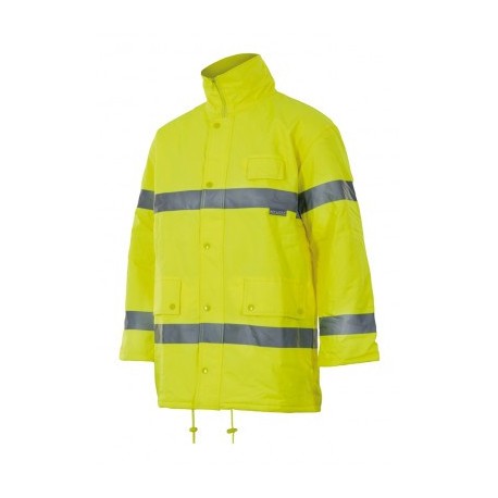 Parka de alta visibilidad con cintas reflectantes en torso y mangas. Cremallera central oculta con tapeta, botones automáticos, puño interior de canalé, varios bolsillos y capucha desmontable en el interior del cuello.